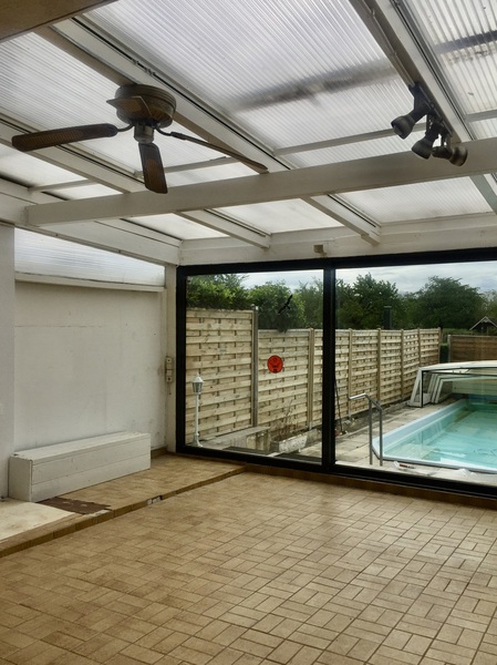 Swimmingpool mit Abdeckung, äußerer Kellerabgang, Klimaanlagen, voll unterkellert, Gäste WC, Wintergarten, Einbauküche, Garage, u.v.m.