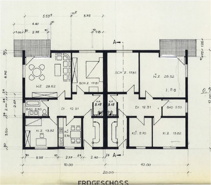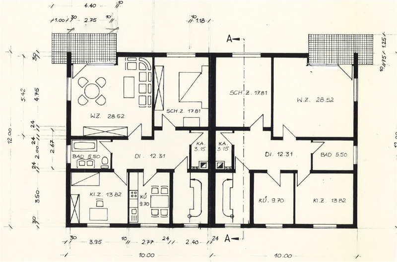 Diese 2 x 3 Familienhäuser wurden im Jahre 1983 in Form eines Doppelhauses errichtet. Jede Haushälfte umfasst drei 3 Zi.- Wohnungen, jeweils mit Küche, Bad/WC und Balkon. ( EG, 1.OG und