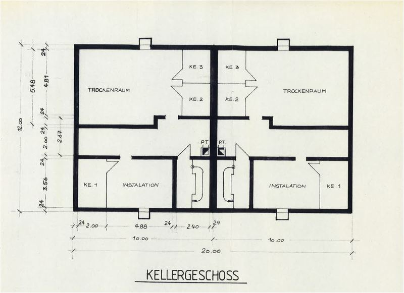 Keller, massive Decken und doppelschaliges Mauerwerk zwischen den Häusern.