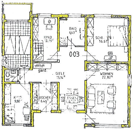 Die Wohnung ist bestens geschnitten, siehe Plan oben. Es sind Parkett- und Fliesenböden verlegt. Das große Bad besitzt ein Fenster, es gibt ein Gäste-WC sowie eine nach Süden ausgerichtete Loggia, ferner ist eine ( ältere, jedoch intakte ) Einbauküche vorhanden. Zur Wohnung gehört ein großer Kellerraum. Optional kann eine Einzelgarage hinzugemietet werden. ( mtl. € 50,- )